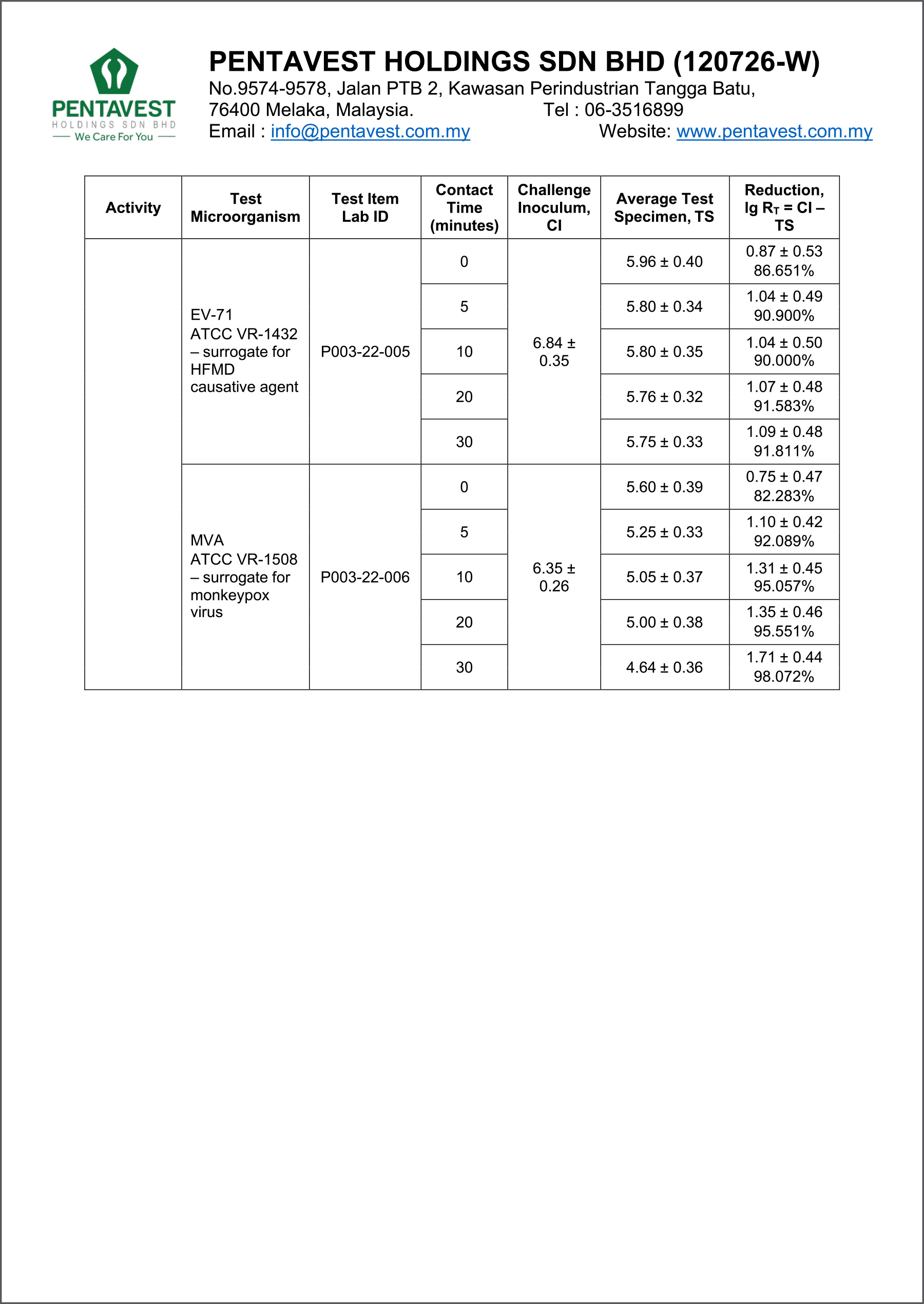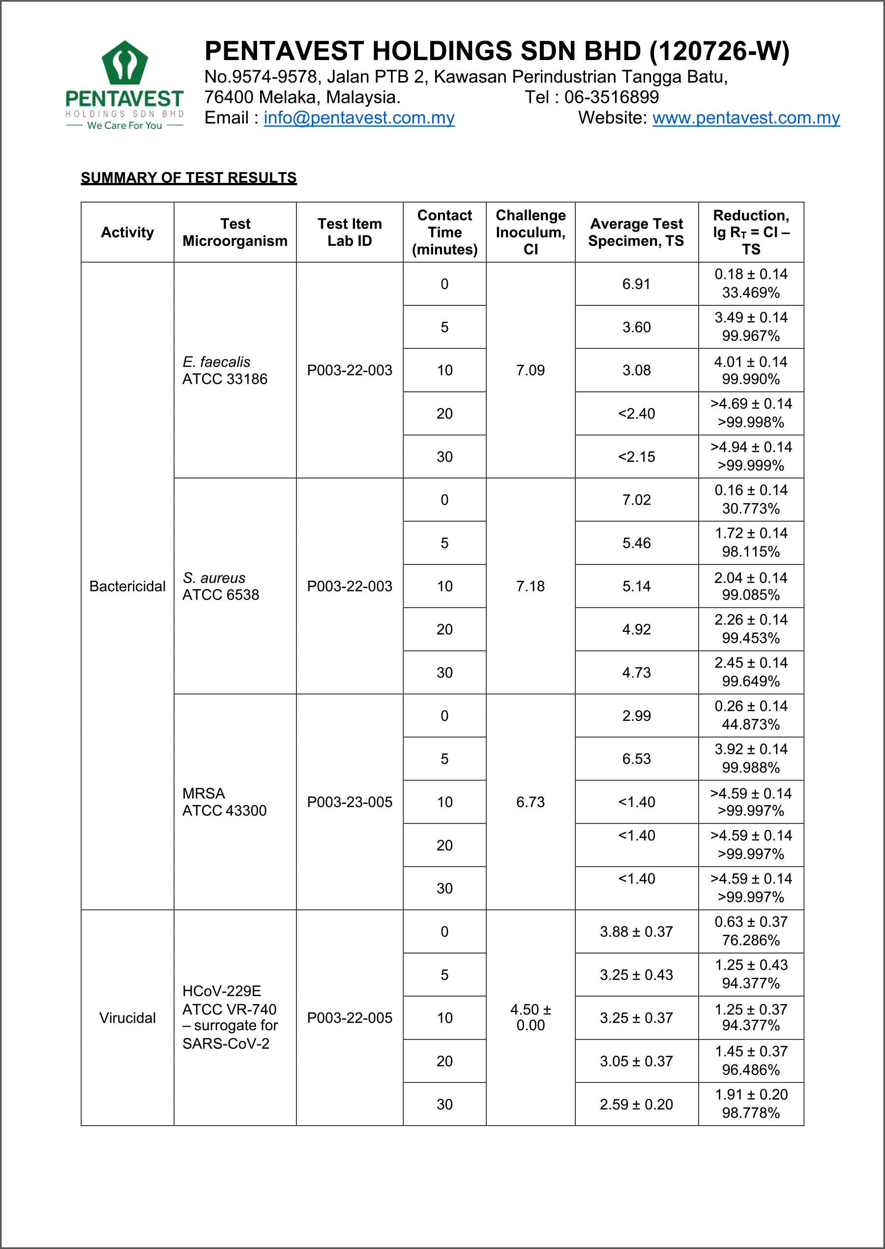 According to ASTM D7907-14 (2019), conducted by ISO 17025 Accredited Antimicrobial Testing Laboratory, it has been proven to de-activate and have killing effect against various types of viruses, bacteria and microorganisms.