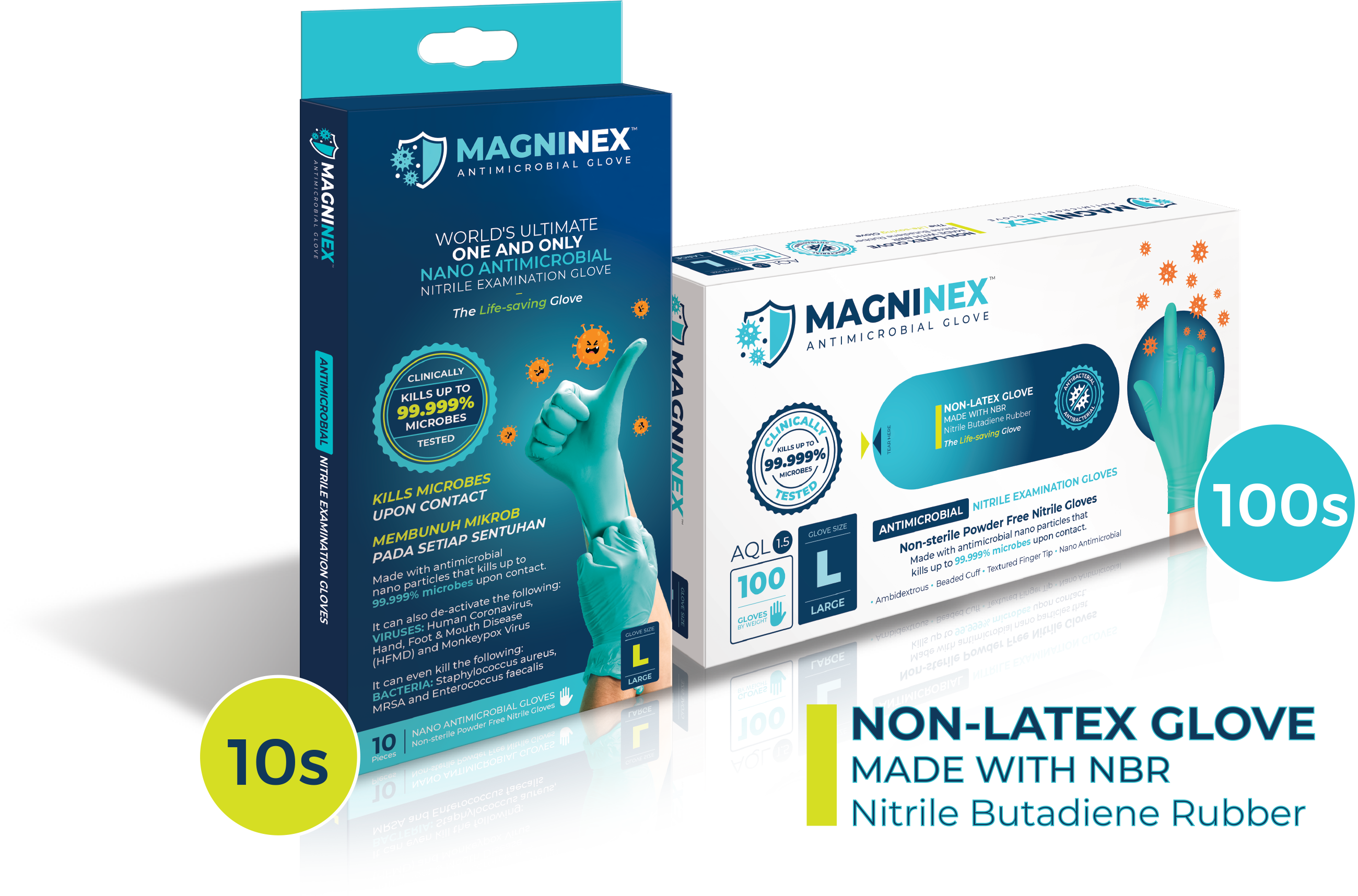 MAGNINEX gloves contain proprietary NANO Organic Particles regarded as Micelles that are embedded in the latex during the manufacturing process. Due to the size of the NANO Organic Particles, it is able to exhibit the physical properties of the particles far more superior compared to regular gloves. Furthermore, it also enhances the tensile strength of the MAGNINEX glove with better retention period throughout the aging process.
