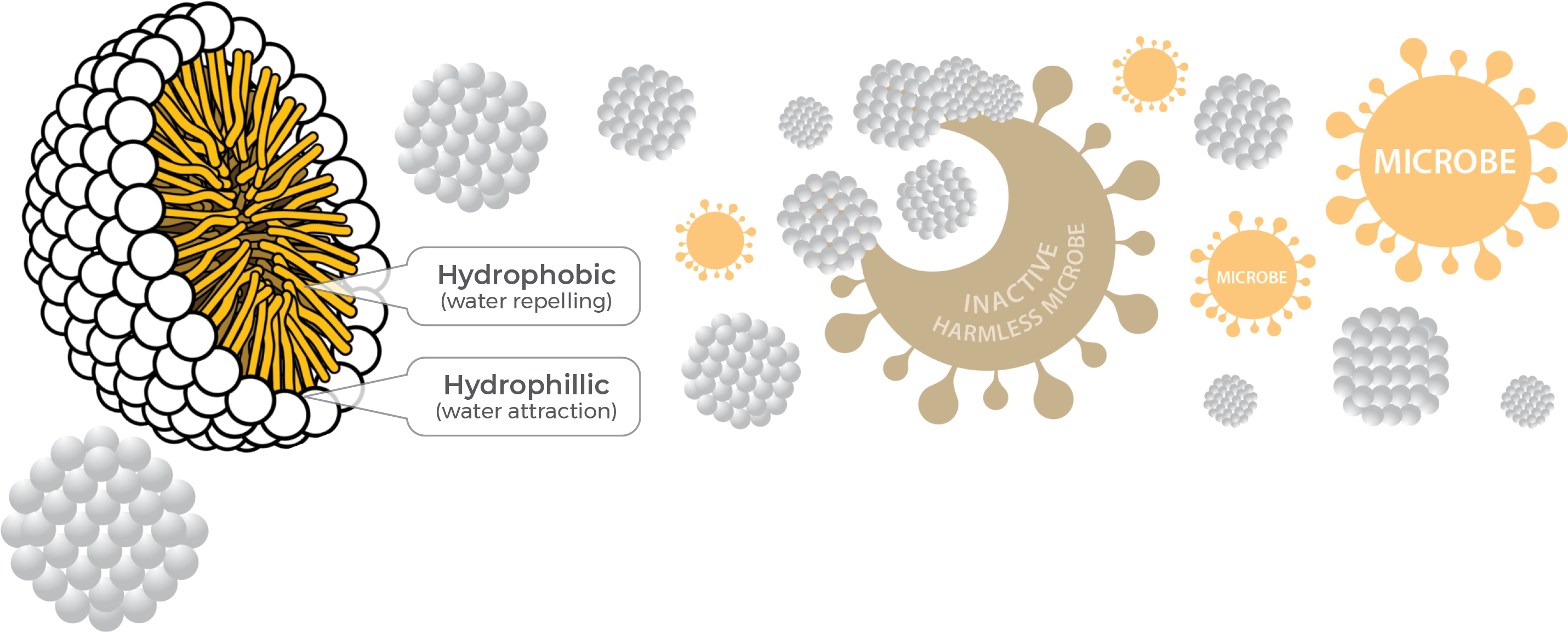 When the microbes come into contact with the MAGNINEX Antimicrobial Glove, the hydrophobic tails of the free-floating micelles attempt to evade water. In the process, they wedge themselves into the lipid envelopes of the microbes, prying them apart.